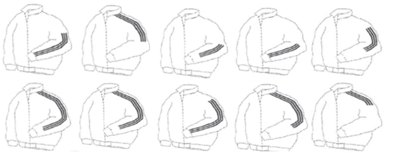 1. Firstly, she was not persuaded that the scope for variation was truly limited. While the stripes had to be parallel and evenly spaced, their length, starting point and finishing point were left undefined, giving rise to a wide range of visually distinct outcomes (as illustrated by the graphic below). The description also failed to confine the stripes to the outer side of the sleeve, leaving open the possibility of placement on the underside.