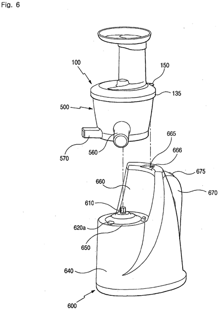 There are two relevant embodiments, shown in Figs. 2 and 6. The housing 500 is where all the food material gets pressed and ground, and this is held with respect to the drive unit 600 by slightly different features in the two embodiments.