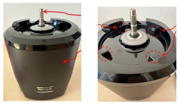 The images below show the top of the drive unit of the Auto10 juicer – the blocks indicated in the right hand image serve to prevent relative rotation between the housing and the drive unit, but do not prevent lifting of the housing from the drive unit.