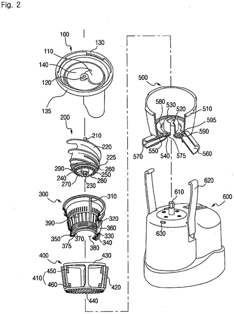 It was agreed at first instance between the parties that the housing of the Auto10 juicer fits onto the drive unit to prevent rotation or lateral movement of the housing. But it is only held in place vertically by gravity. Therefore the housing can be lifted away from the drive unit and also can vibrate. Based on its interpretation of claim 1 as requiring fixation of the housing to prevent vertical lifting of the housing and to reduce vibration, the CoA decided that the Auto10 does not infringe. A possible further question that does not seem to have been addressed in detail is whether the weight of fruit in the massive hopper in the alleged infringement might provide the required fixing of the vertical position of the housing in use.