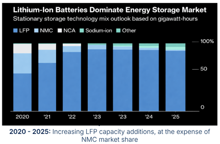 Lithium-ion systems (e.g., LFP, NMC and NCA) remain the dominant technology, accounting for more than 90% of installations (see graph below). However, as reported last year, alternative chemistries like sodium-ion and flow batteries are garnering increased industry attention, especially for longer duration applications.