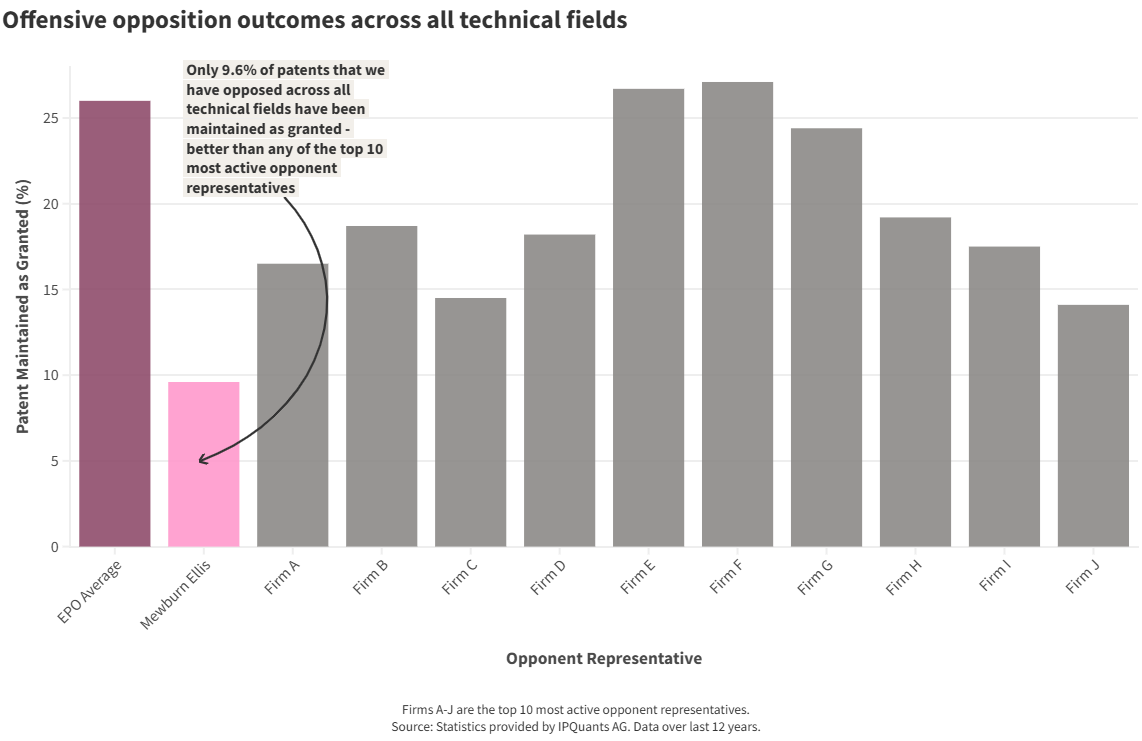 We have extensive experience in defending EP patents under opposition. Over the past 12 years, Mewburn Ellis ranks: