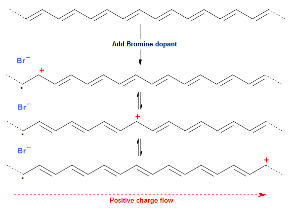 Traditional organic polymers are the antithesis of conductive. However, Alan Heeger, Alan MacDiarmid and Hideki Shirakawa developed polymeric architectures with remarkably high conductivity. Taking inspiration from doping methods commonly used in semiconductors, MacDiarmid and Heeger doped sulfur nitrile polymers with bromine atoms to induce a 10 fold increase in conductivity. Doping with bromine removes an electron from the polymer strand, leaving a positive ‘hole’ to shuttle down the length of the polymer and transfer charge like a molecular wire.